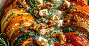 Layered Roasted Sweet Potato, Pumpkin, Carrot & Spinach Gratin with Goat Cheese & Maple Walnut Drizzle